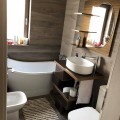 Partea inferioara contine un corp din MDF de 18 mm, atat pentru carcase cat si pentru fronturi. Blatul ghiuveteleor este din MDF lucios de 24 mm. Sertarele si fronturiile corpuriilor inferioare contin feronerie cu inchidere silentioasa marca BLUM.