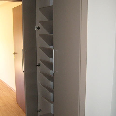Balamalele folosite sunt marca Blum. Interiorul dulapului a fost conceput in totalitate pentru depozitare de pantofi.
