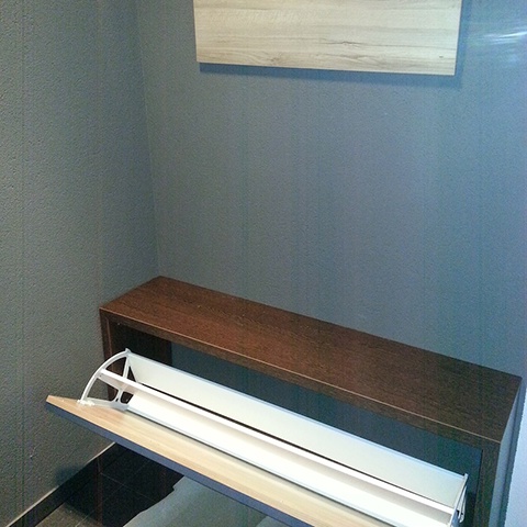 Mobilier de hol executat din pal melaminat marca Egger de 18mm dublat, cantuit cu ABS de 2mm. Feroneria folosita este marca Blum.