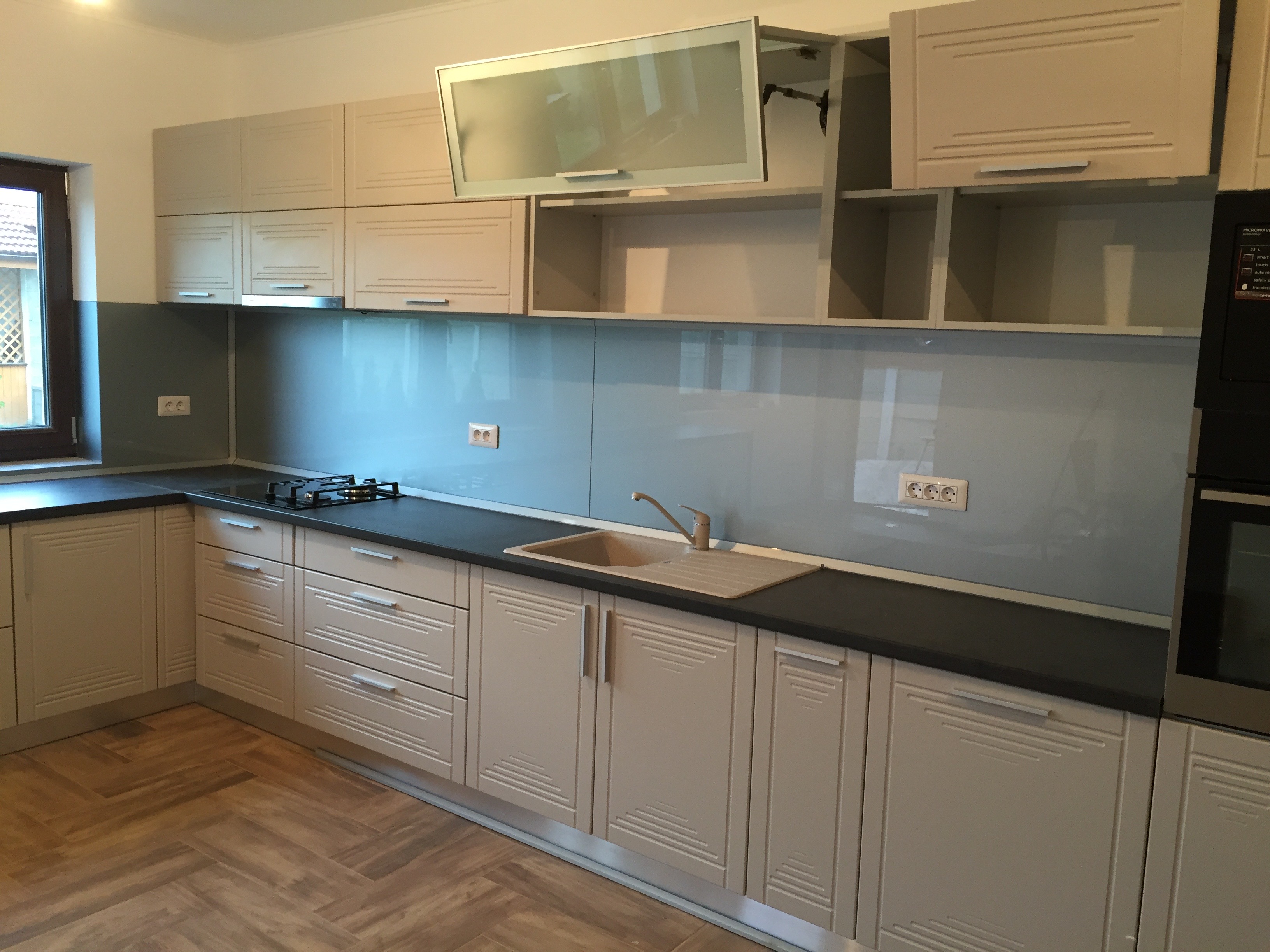 Bucatarie realizata din pal melaminat de 188 mm cantuit cu ABS de 0.4 mm pe carcase. Fronturiile sunt realizate din MDF marca Nett Front, feroneria folosita este integrala cu amortizare, la seratre s-au folosit glisiere cu laterale metalice Antaro de la Blum cu rezistenta la incarcatura de 35 kg, la corpurile suspendate s-au folosit sistemele de ridicare cu reglaj de intensitate Aventos de la blum, cosul jolly este prevazut cu sistemul Tandembox de la Blum ceea cei confera o rezistenta mai mare la incarcare si amortizare la inchidere.