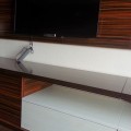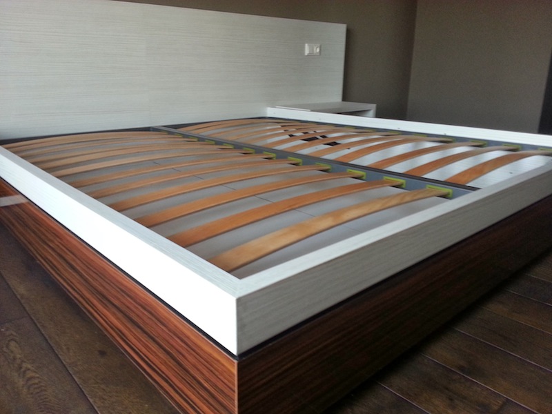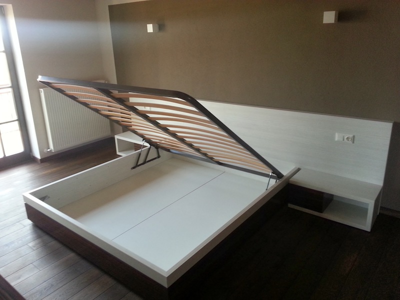 Feroneria folosita este marca Blum in intregime prevazuta cu sisteme de amortizare. Imbinarea celor doua nuante de culori de la pat am realizato cu un profil de aluminiu vopsit in nuanta neagra. Patul este prevazut cu sistem de rabatare si cu somiera metalica vopsita in camp electrostatic. Lamelele somierei sunt din lemn de fag stratificat si fierte in ulei de in pentru a le asigura rezistenta in timp si elasticitate.